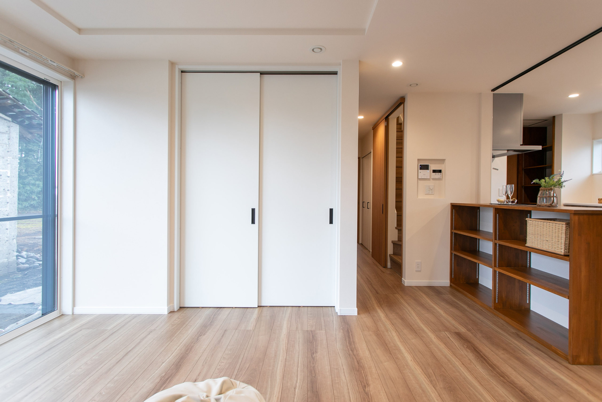 リビングの造作棚。棚と柱を同色に。