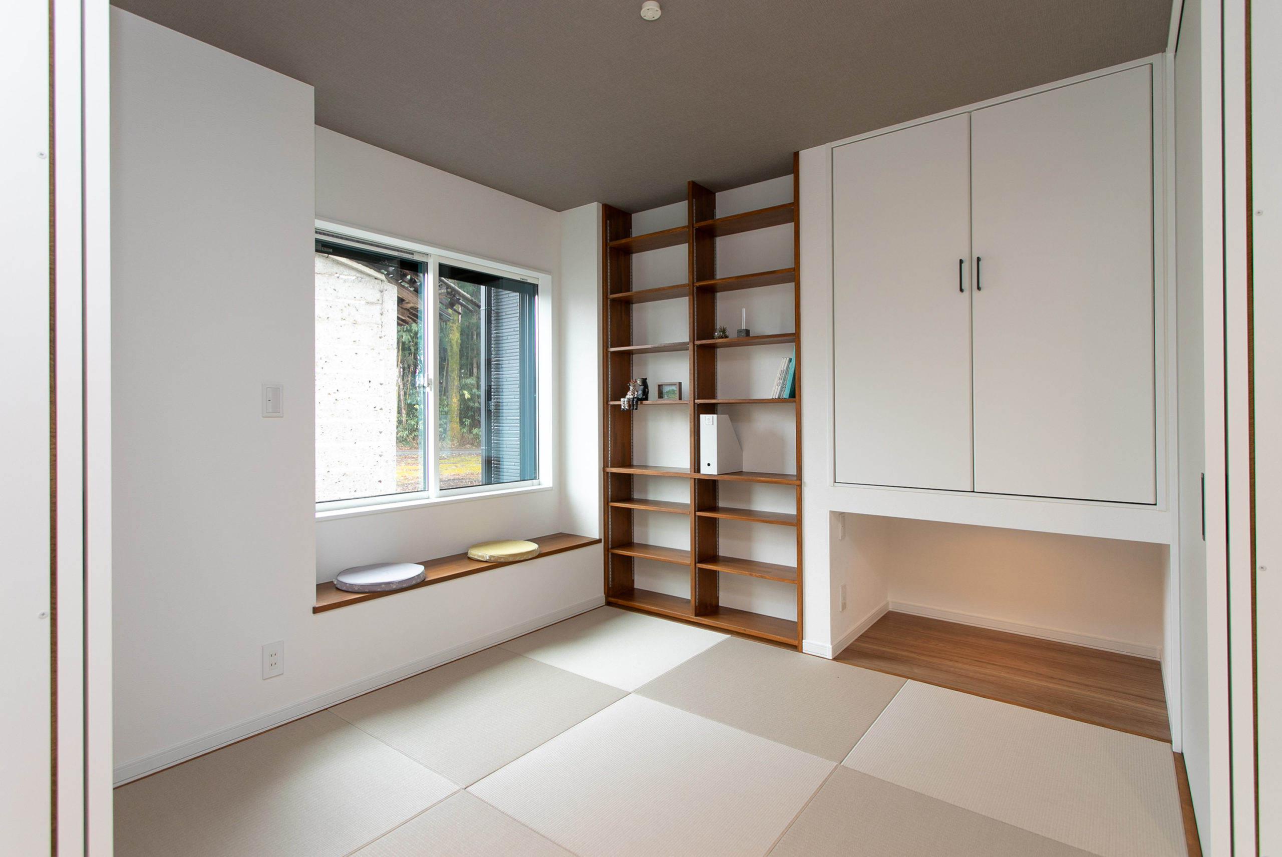 畳コーナーには本棚を造りました。棚の幅を変えて色々なサイズの本に対応します。写真右の押入れには来客用布団を収納します。窓際にはベンチを設けました。