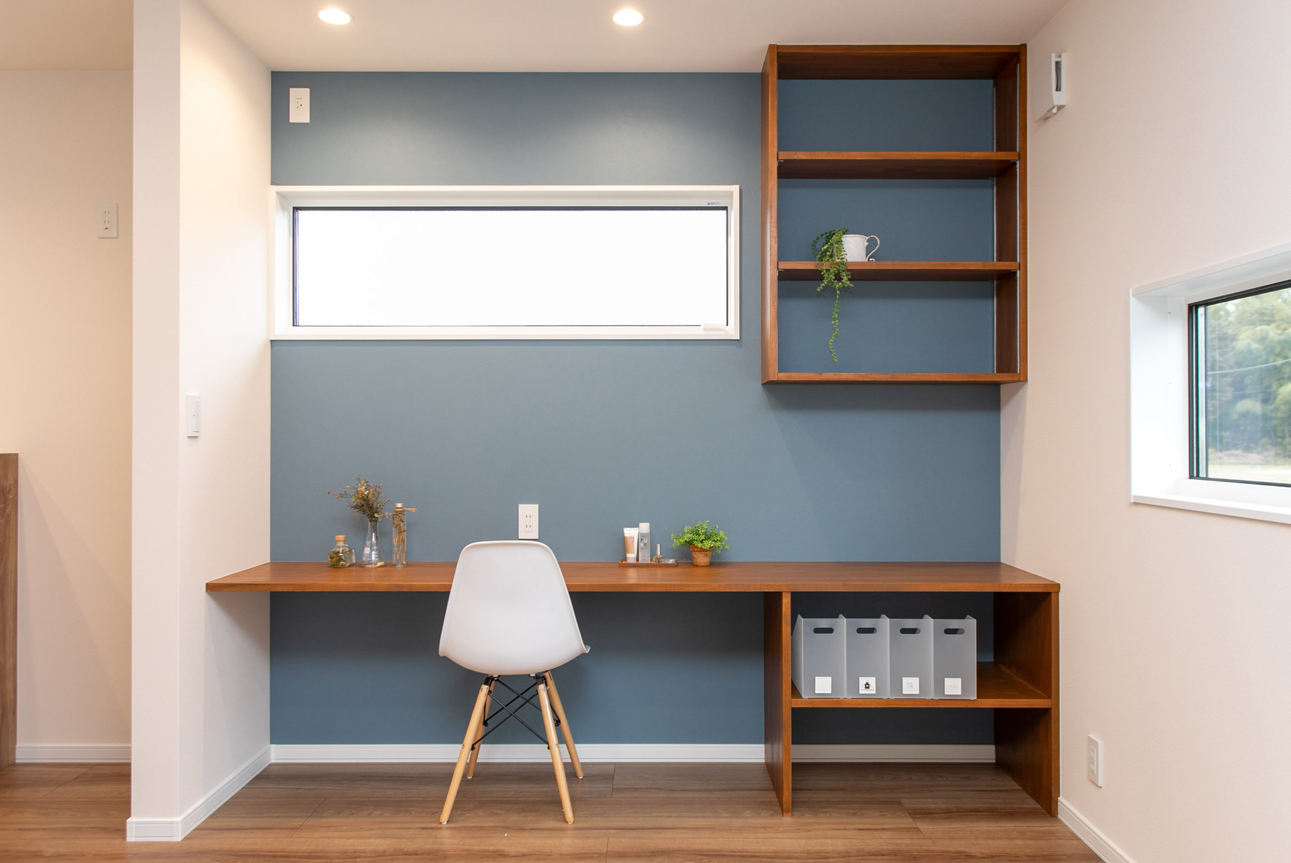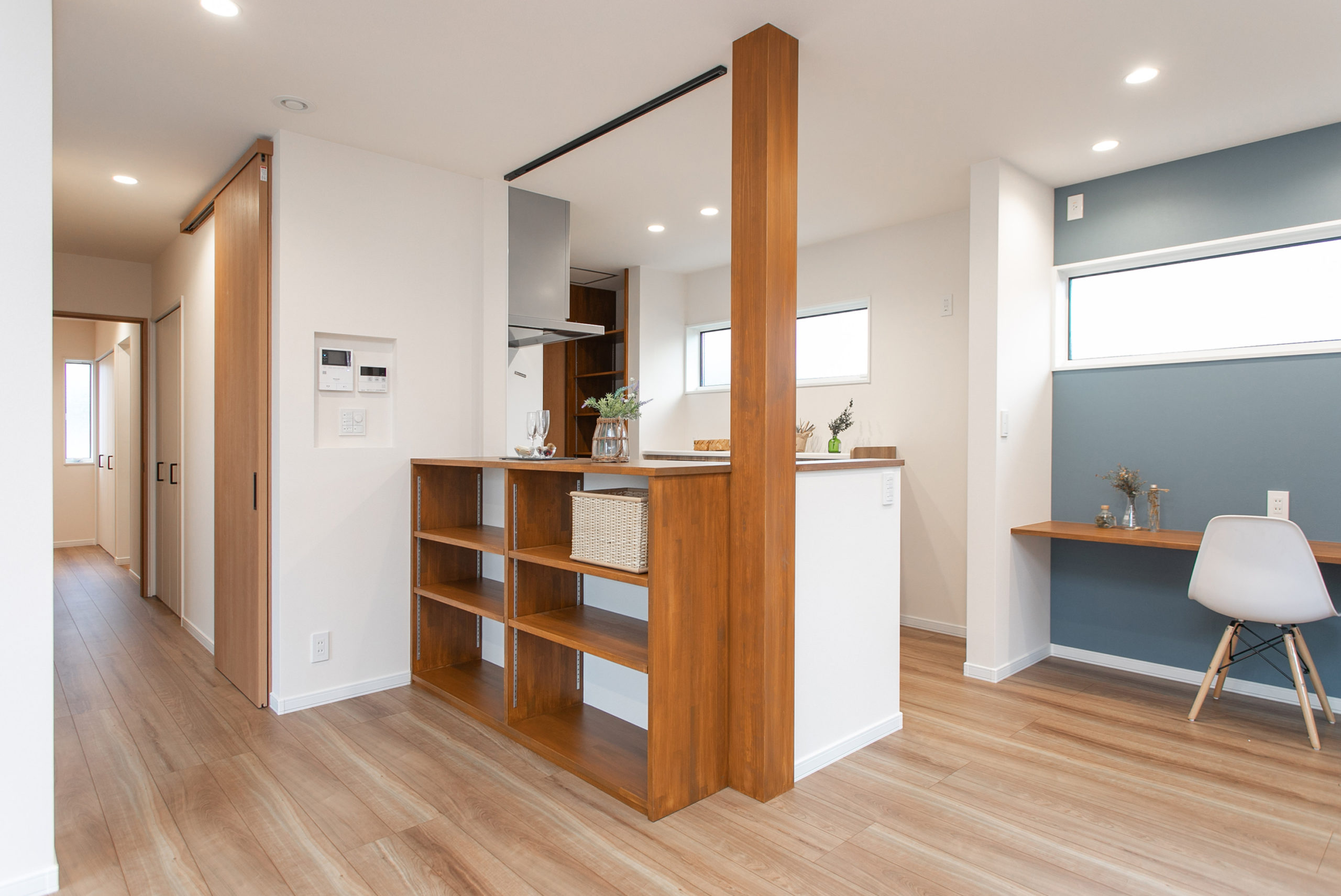 LDKの一角にあるスタディカウンター。ブルーのクロスがリビングのアクセントに。