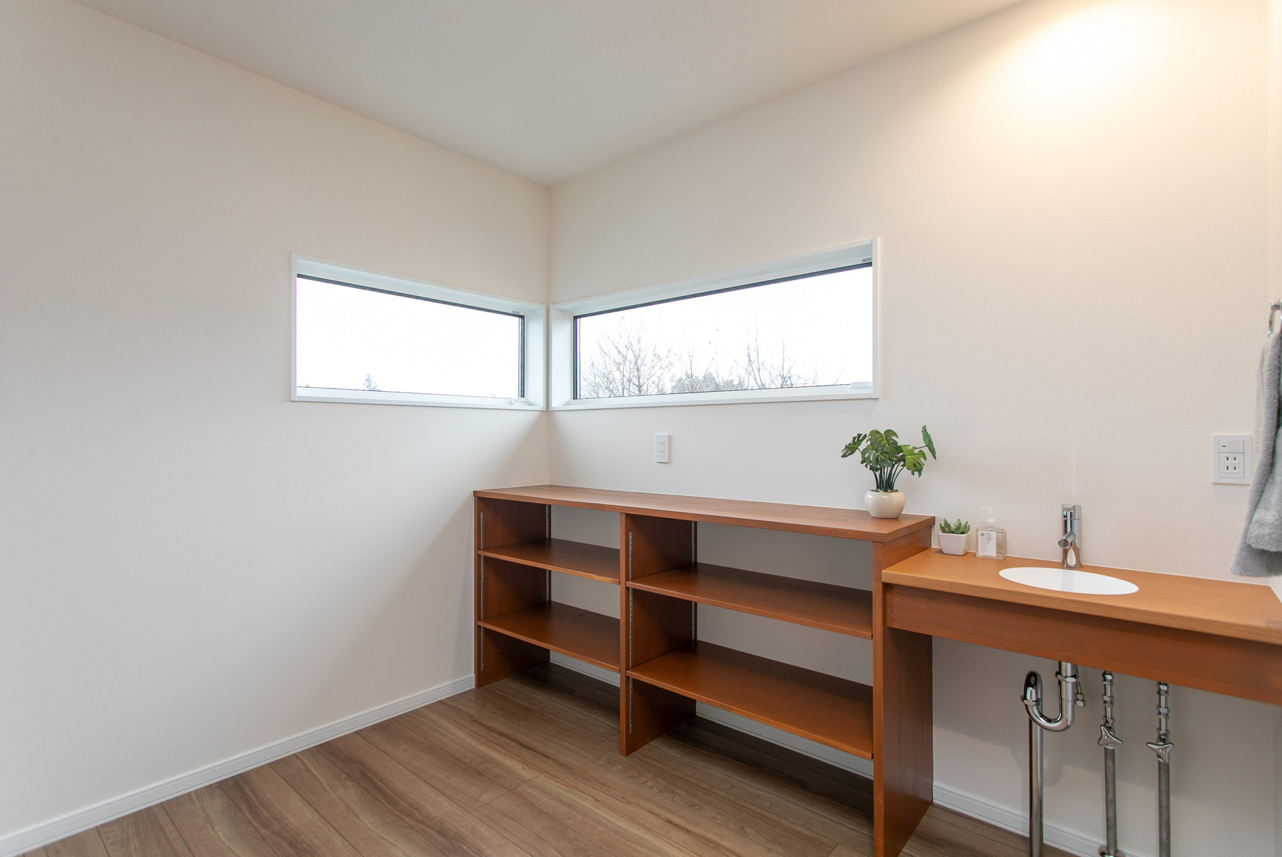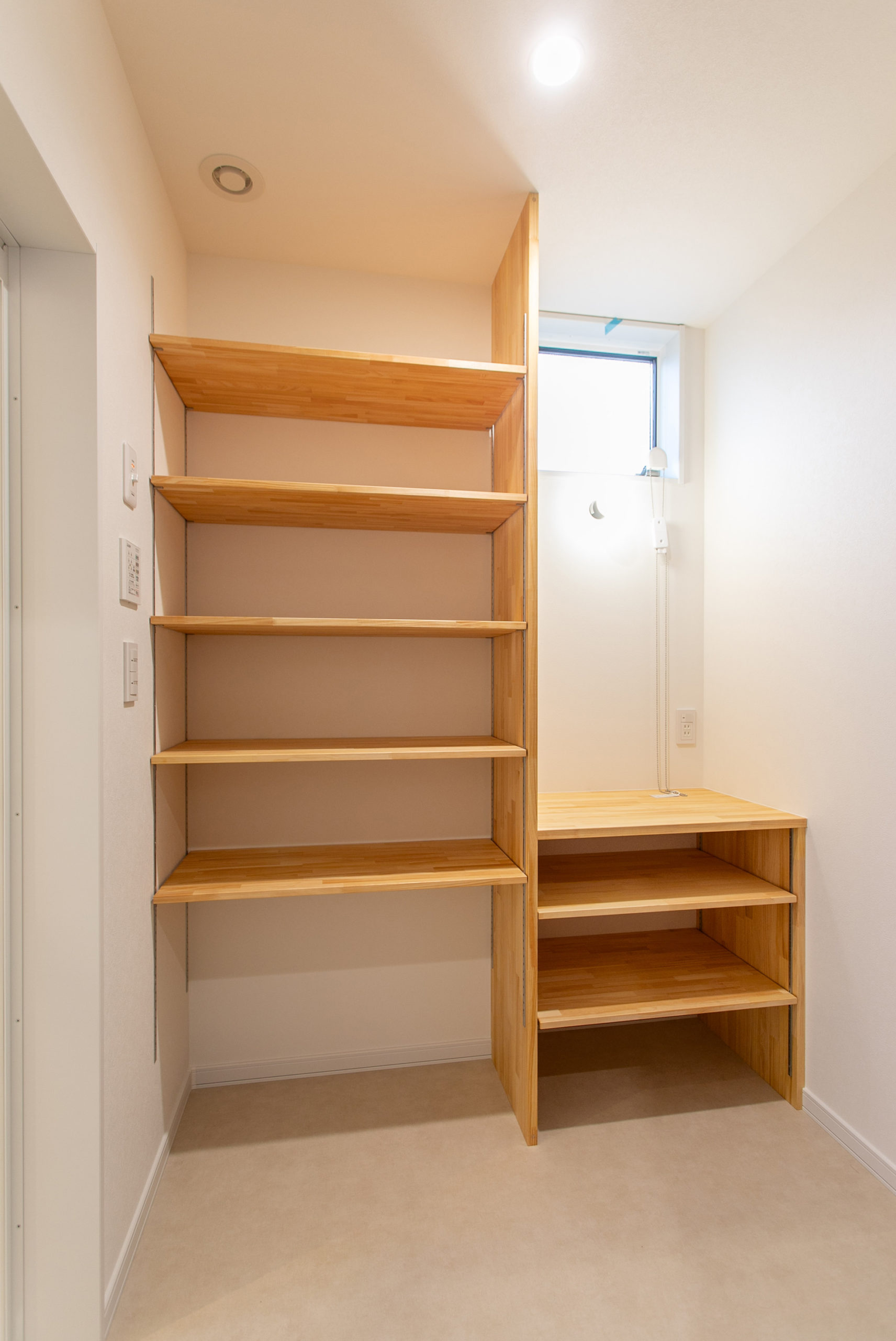 大工が造る造作棚により、スムーズにお片付けができる家になりました。家族の生活スタイルに合わせた収納計画で使い勝手の良い場所に棚があるので、サッと出して、サっとしまうことができます。