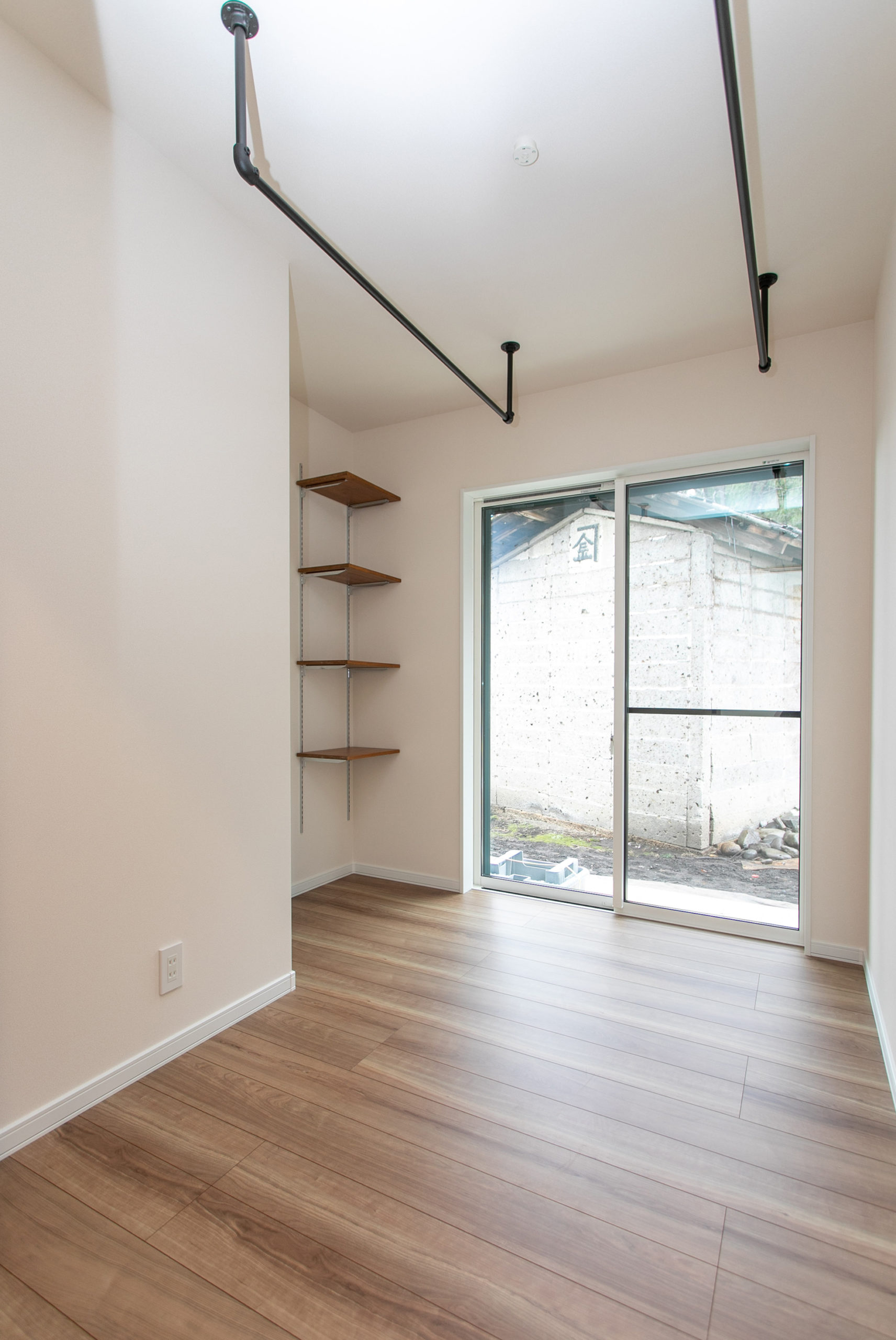 室内物干しスペース。写真奥棚の手前には洗濯機置き場があります。棚には洗剤等を置くことができます。