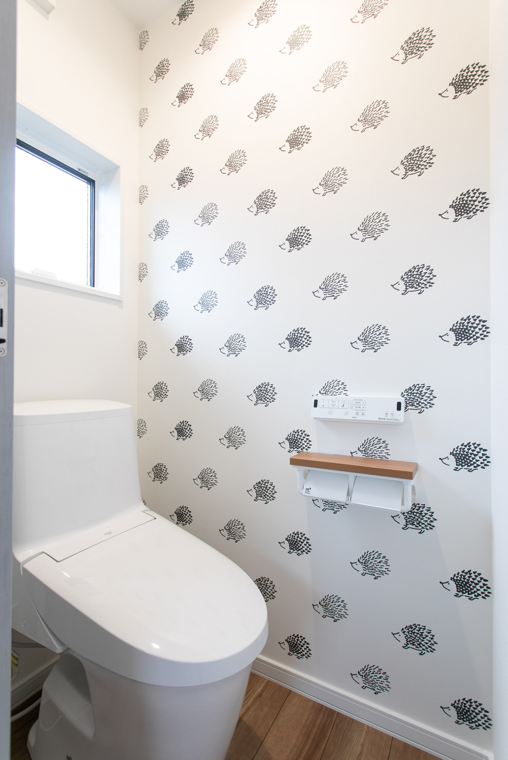 ハリネズミのクロスがとてもキュートです。LIXIL ベーシアシャワートイレ