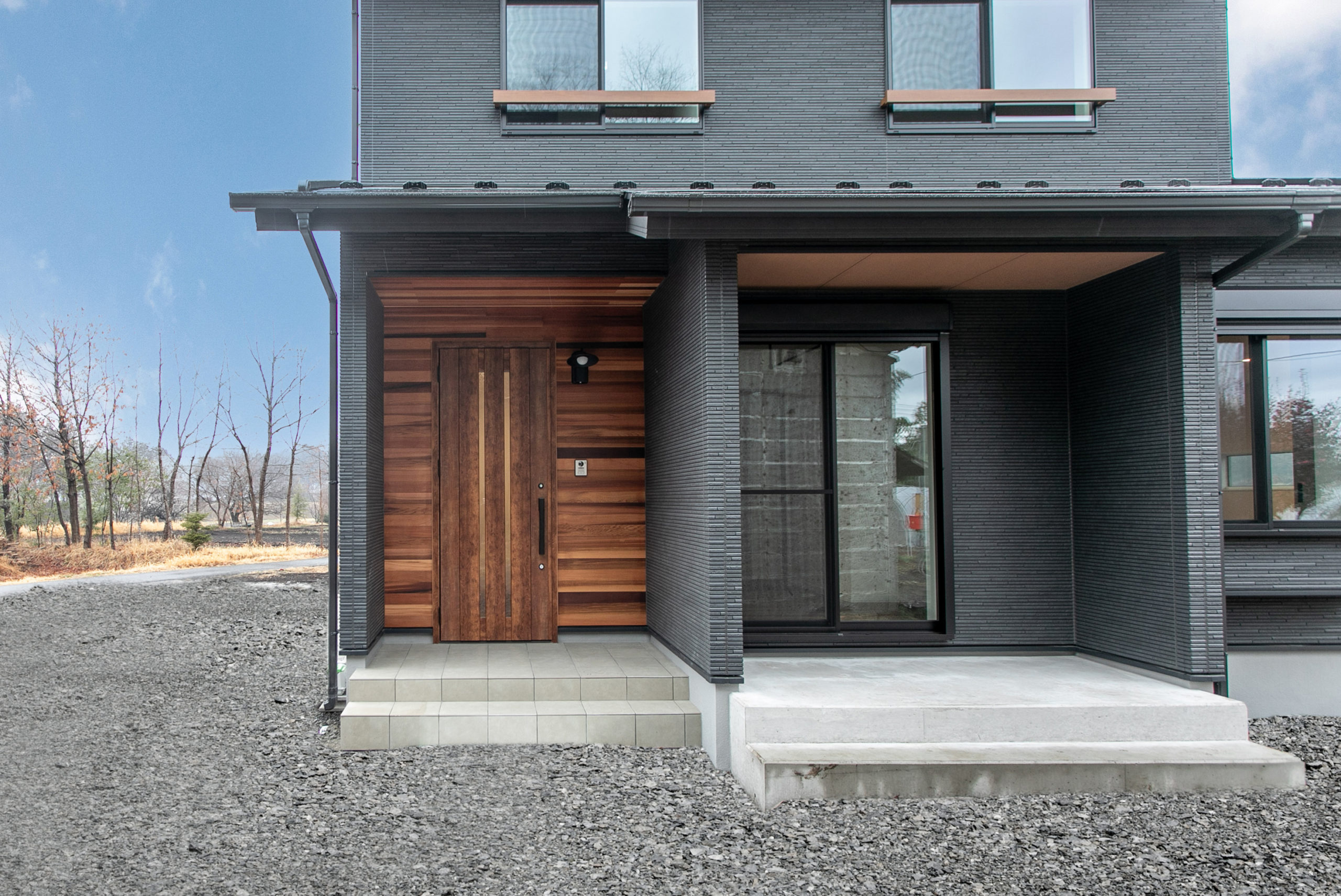 玄関廻り外壁、軒天にレッドシダー材を貼りました。玄関ドア:LIXIL ジェスタP21型