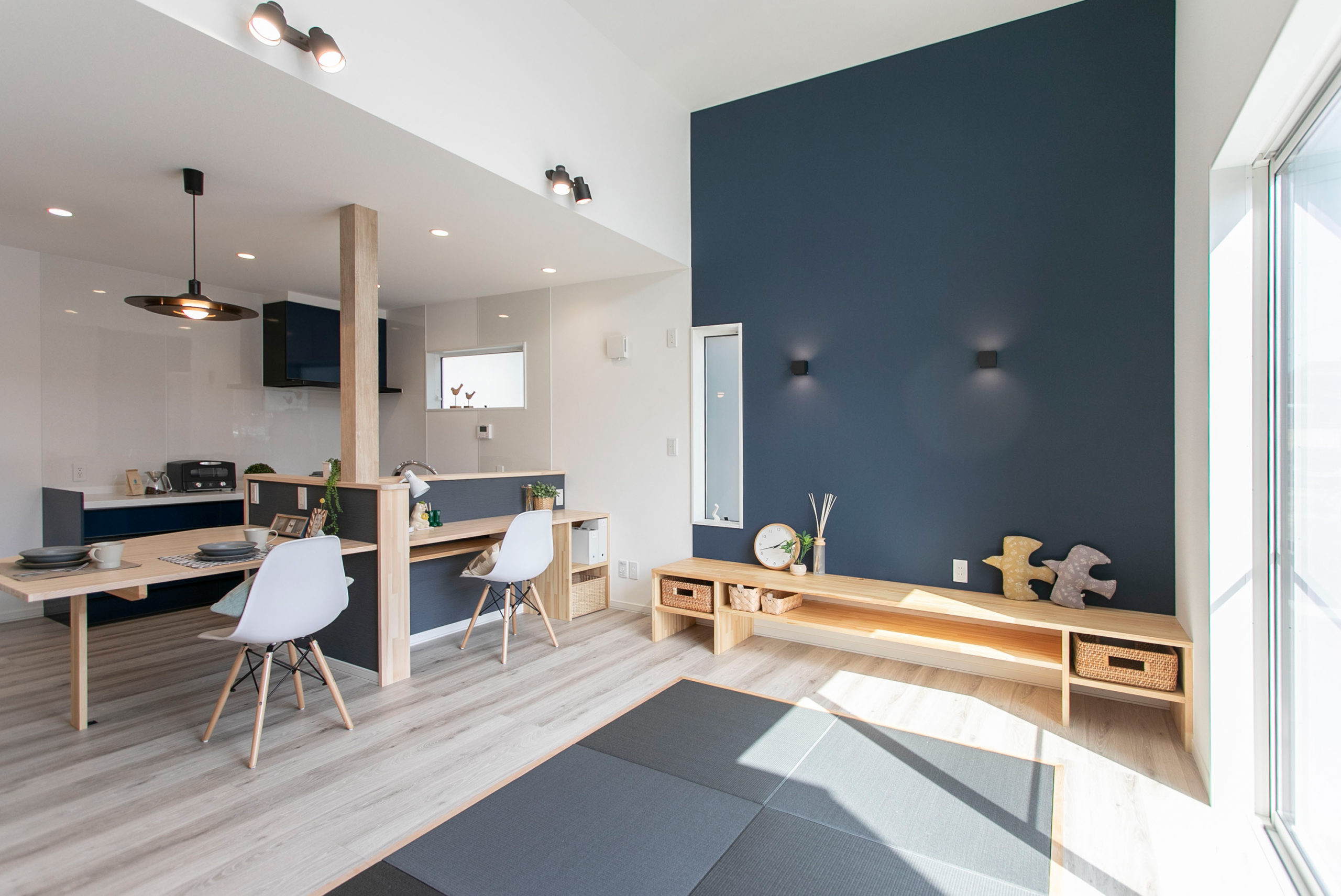 - ネイビーブルーがアクセントのリビング。腰壁でダイニングテーブルとスタディスペースの間を仕切ります。