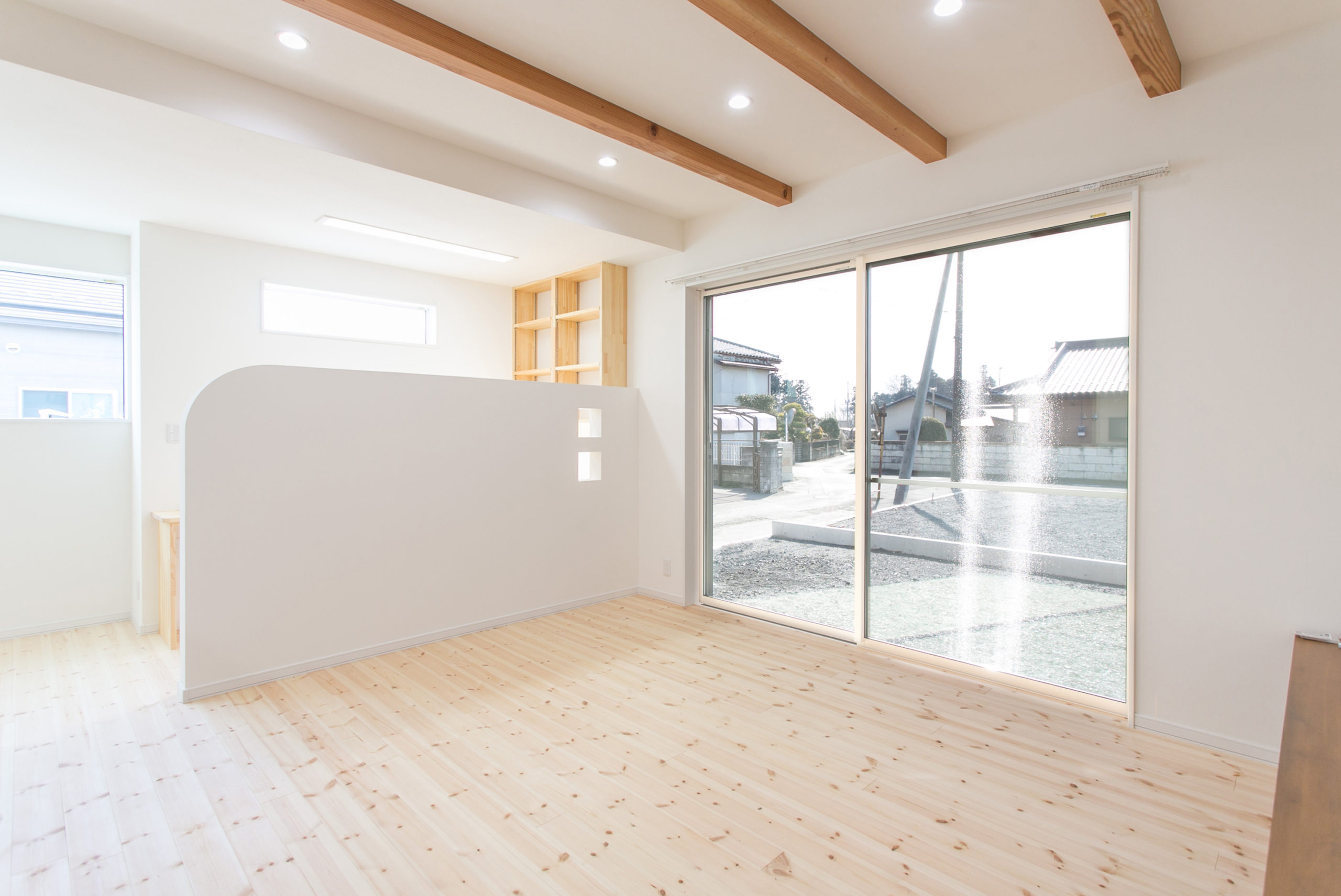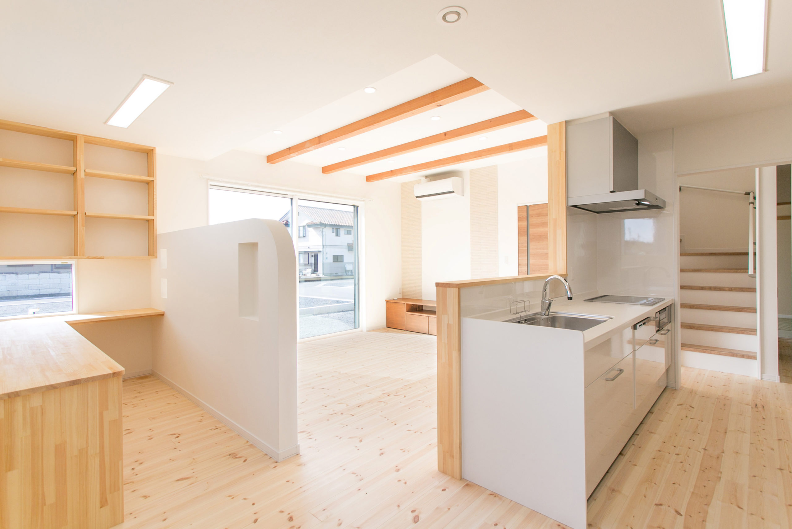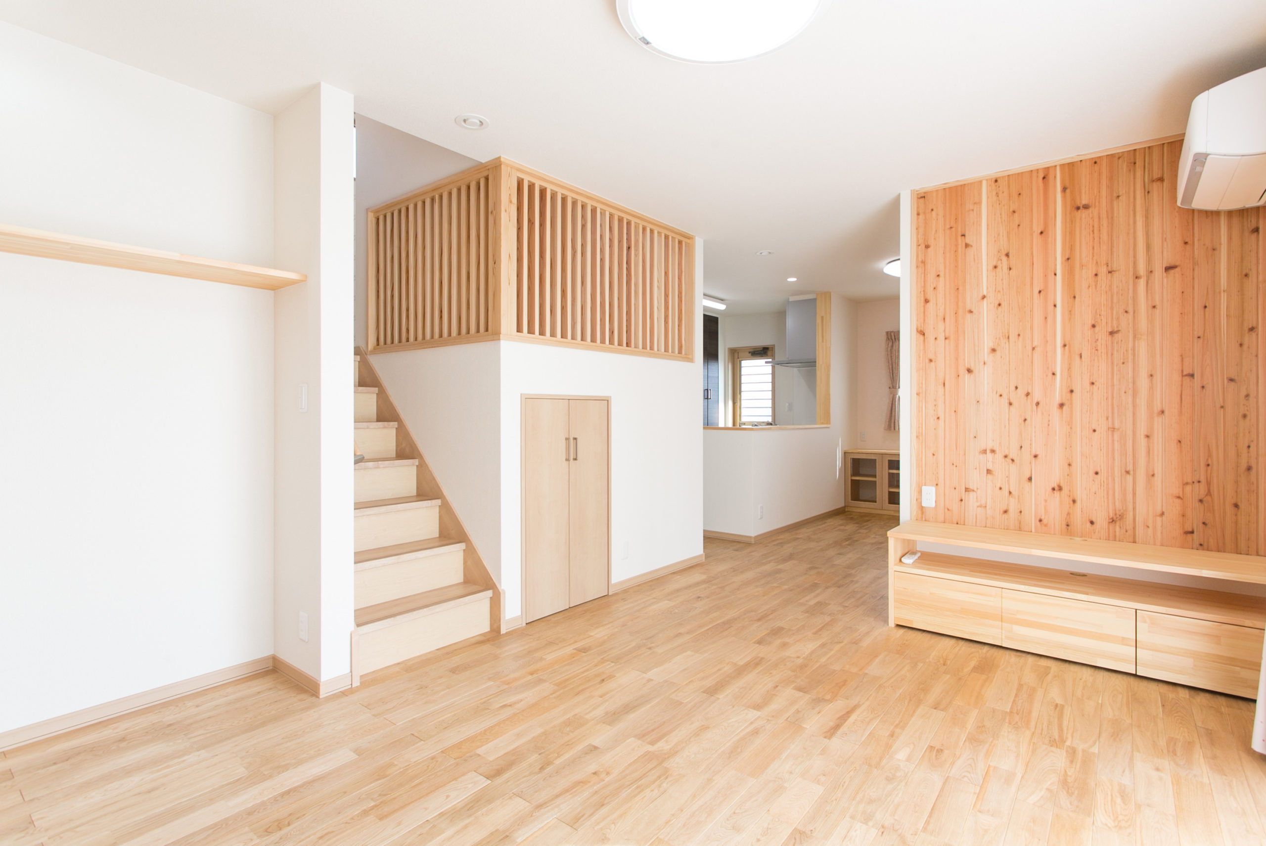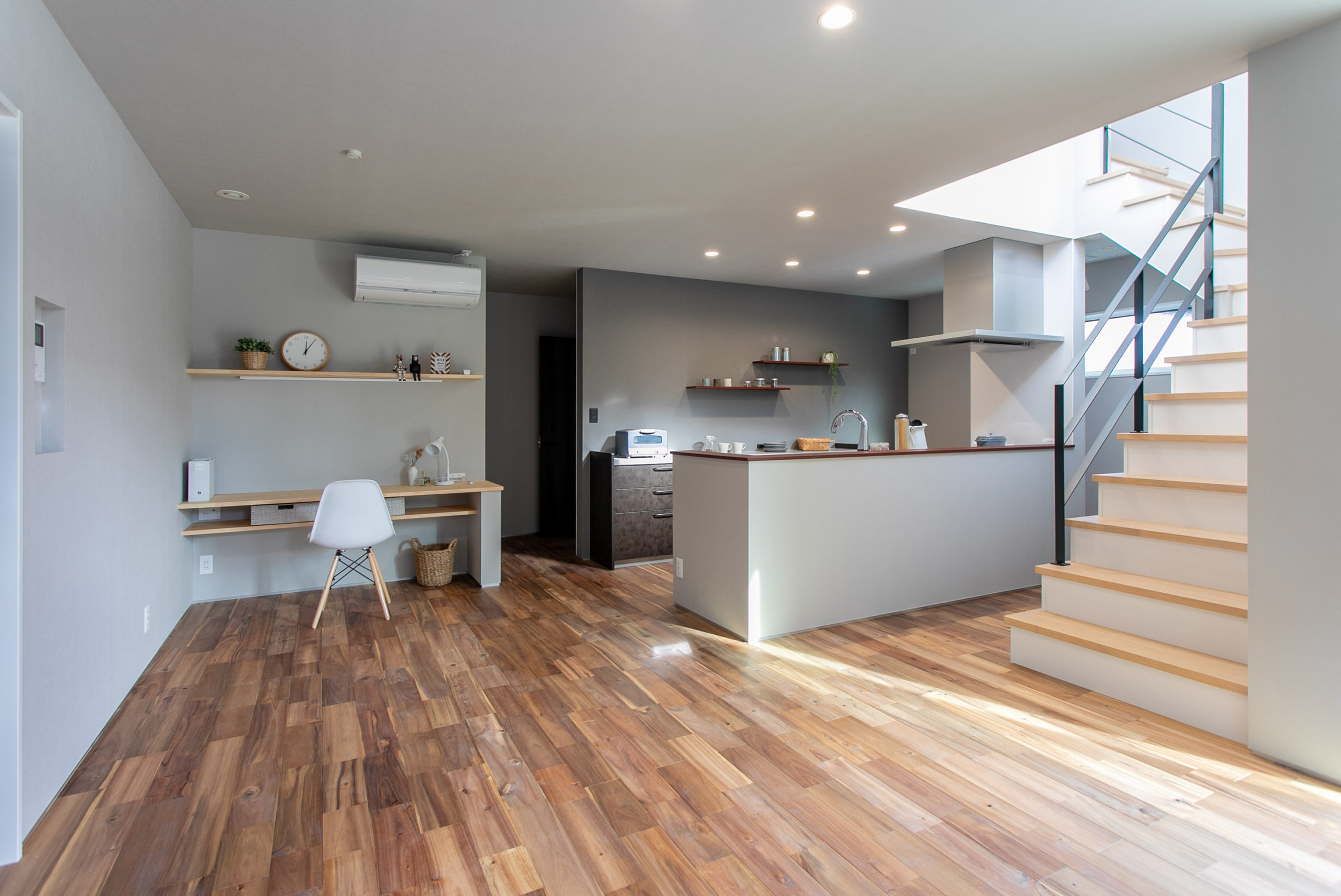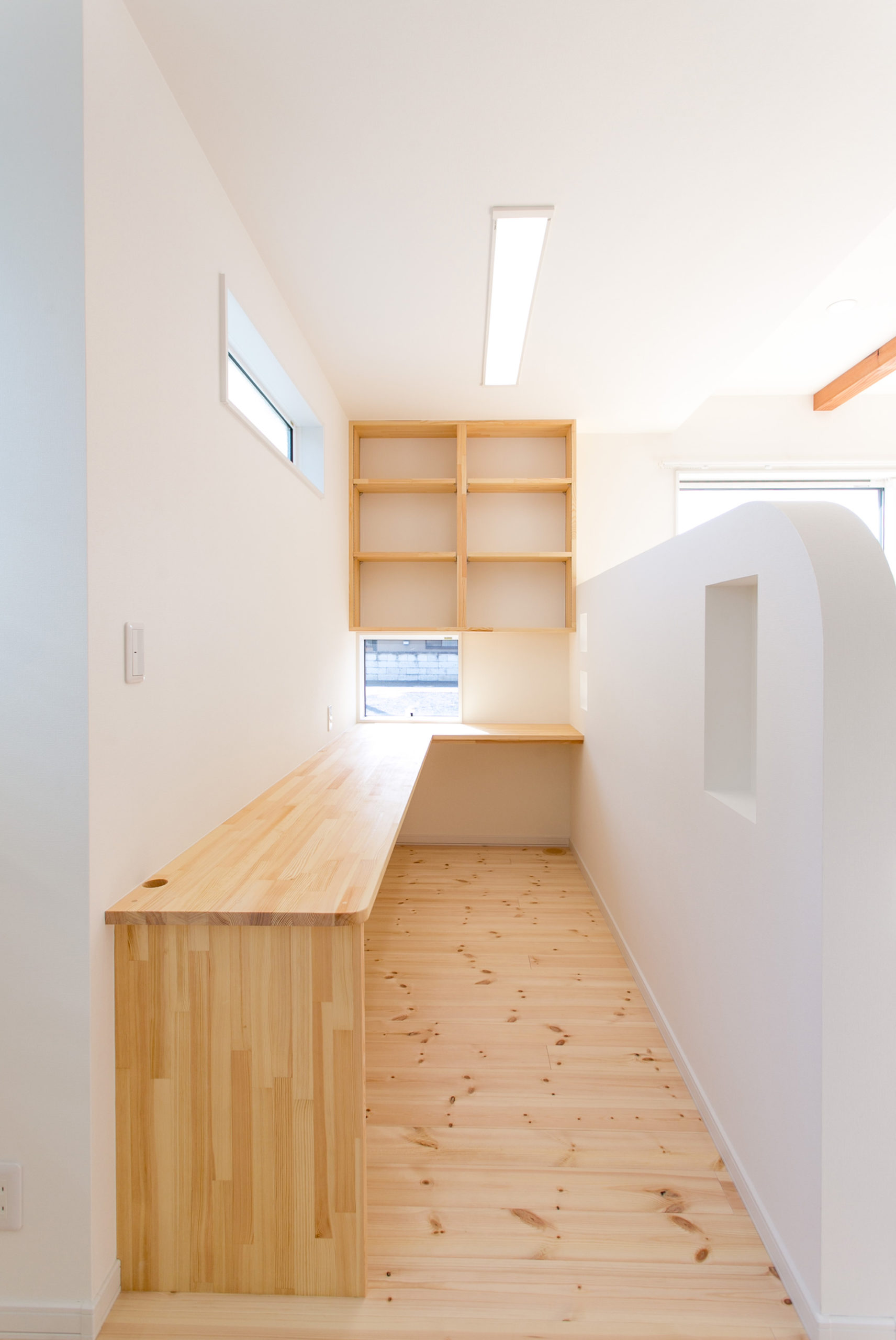 家族と同じ空間にいながら、丁度良い距離感でお子様が宿題をしたり、お父さんやお母さんがパソコンで仕事をしたりできるスタディコーナーをリビングの一角に造りました。造作の棚に勉強道具や書類もすっきり収納します。