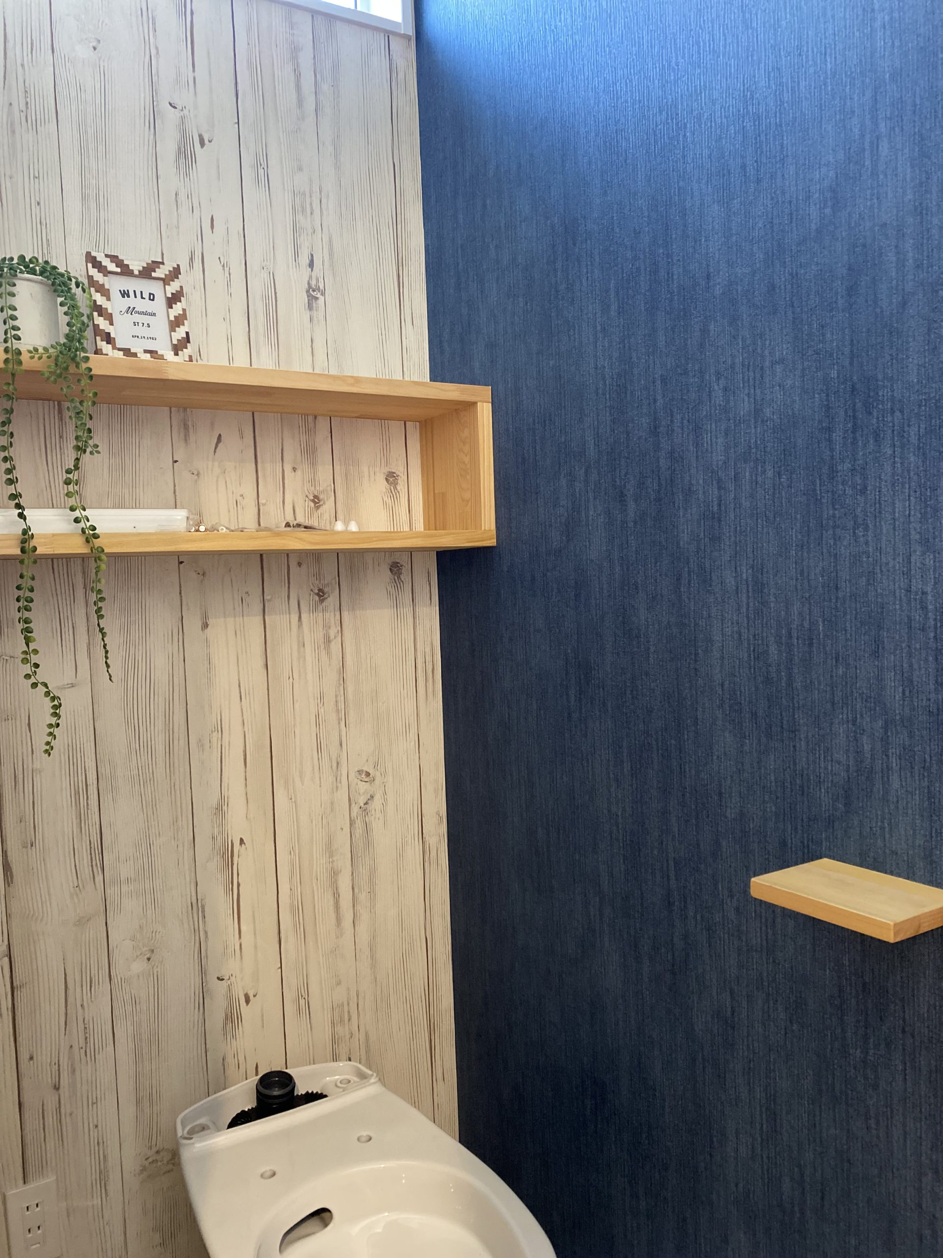 洗面所。ブルーのタイル×木目のクロスでアメリカンな雰囲気に。