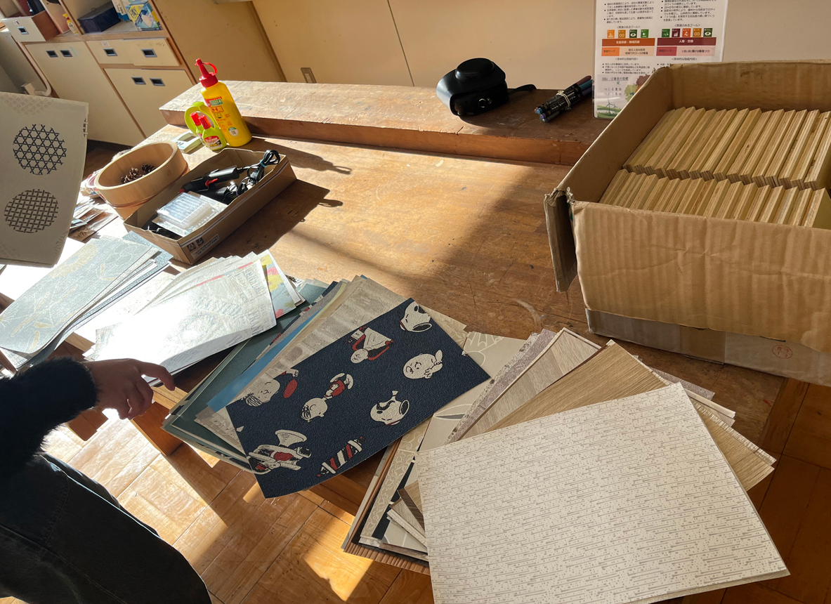 打ち合わせに使用し、そのまま廃棄してしまうクロスサンプルと端材の板を再利用。
